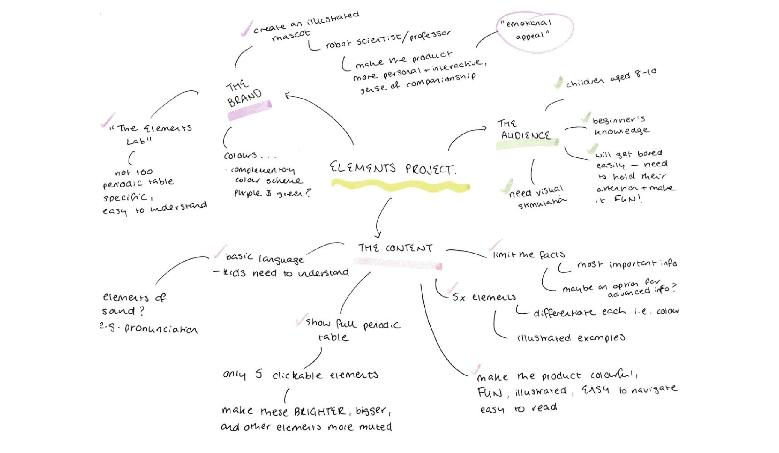 For this project, I chose to create a product for children aged 8-10, that would teach them about the elements of the periodic table. My first step in the process was to consider the most important factors of this task: the audience, the brand and the content.