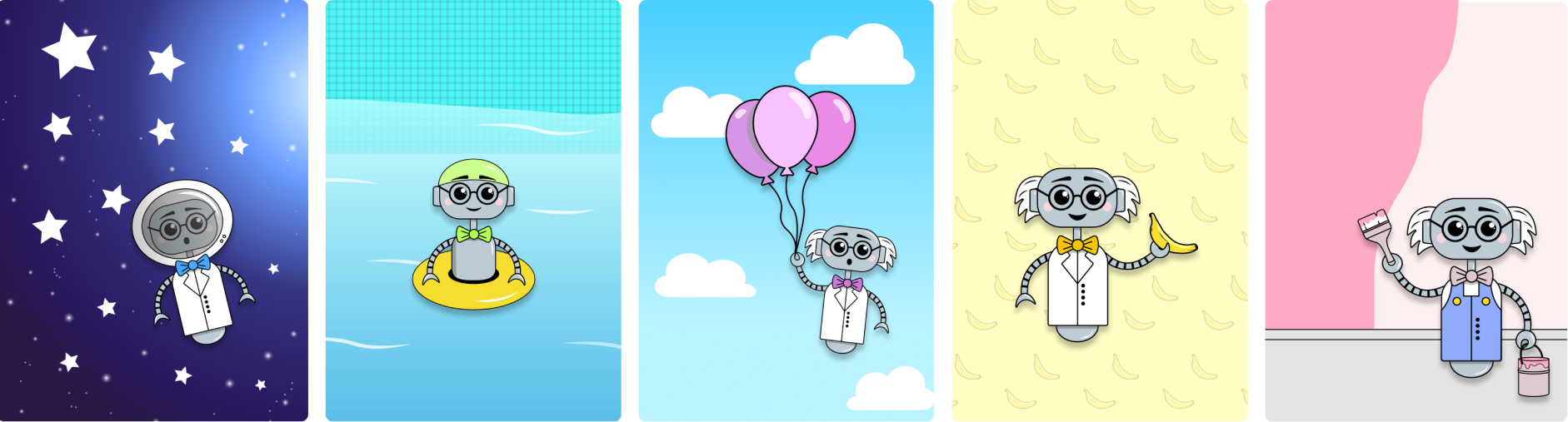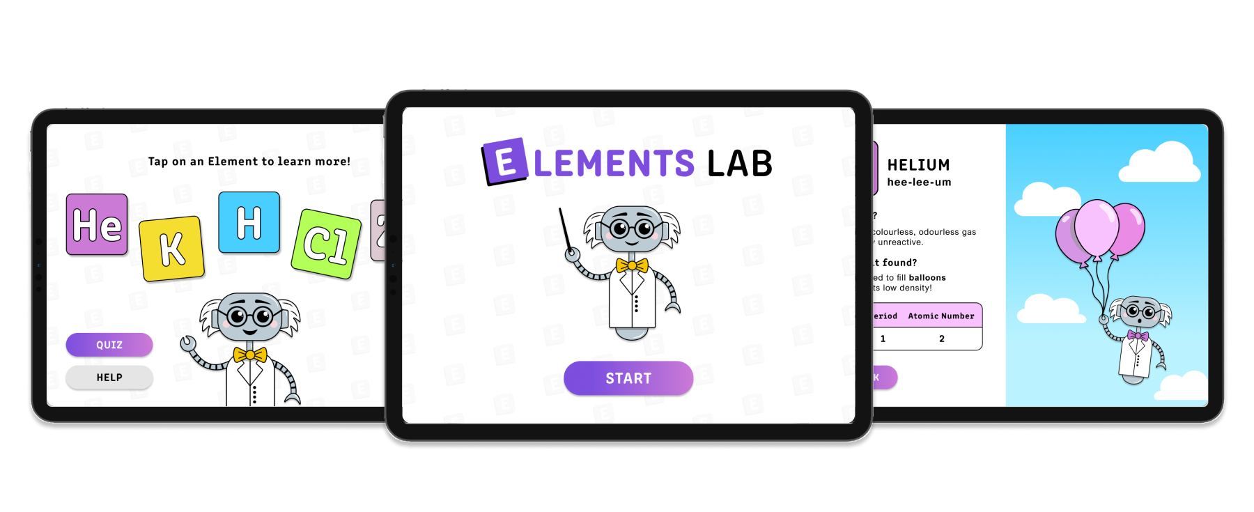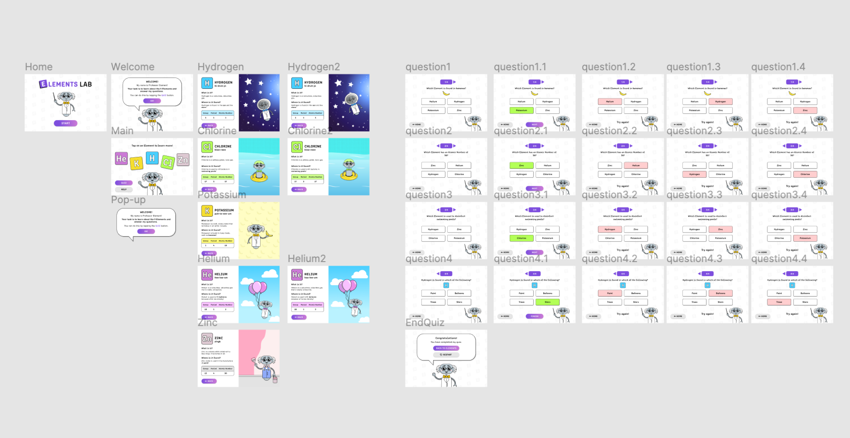 I started the creation process by building the brand to surround my prototype. I chose the name 'Elements Lab' so that the purpose of the brand was immediately clear. Next, I set about creating a mascot for the brand and the app itself. During my research, I learned that providing a mascot, particularly for a younger audience, can give a sense of companionship and make the experience more interactive.